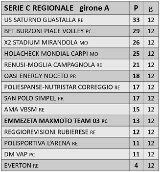 L' Emmezeta MaxMoto Team 03 esce senza punti dalla difficile trasferta contro la capolista Saturno Guastalla. La pausa natalizia porta pochi benefici e l'infermeria rossoblù non ne vuole sapere di svuotarsi. Romanini, infortunata, non è utilizzabile, Rabija in recupero, ma a corto di condizione viene schierata solo nel terzo set, Zucchi e Ruggeri ancora piuttosto acciaccate devono stringere i denti e restano in campo per tutto il match, mentre Cricchini, anch'essa indisposta, parte nel sestetto, ma riesce a restare in campo solo per metà incontro. All'appello mancano anche Rossetti e Lomi, assenti giustificate. Le premesse quindi non sono delle migliori visto il valore assoluto dell'avversario che ad oggi ha perso solo sei set e comanda il girone con quattro punti di vantaggio sulla seconda.